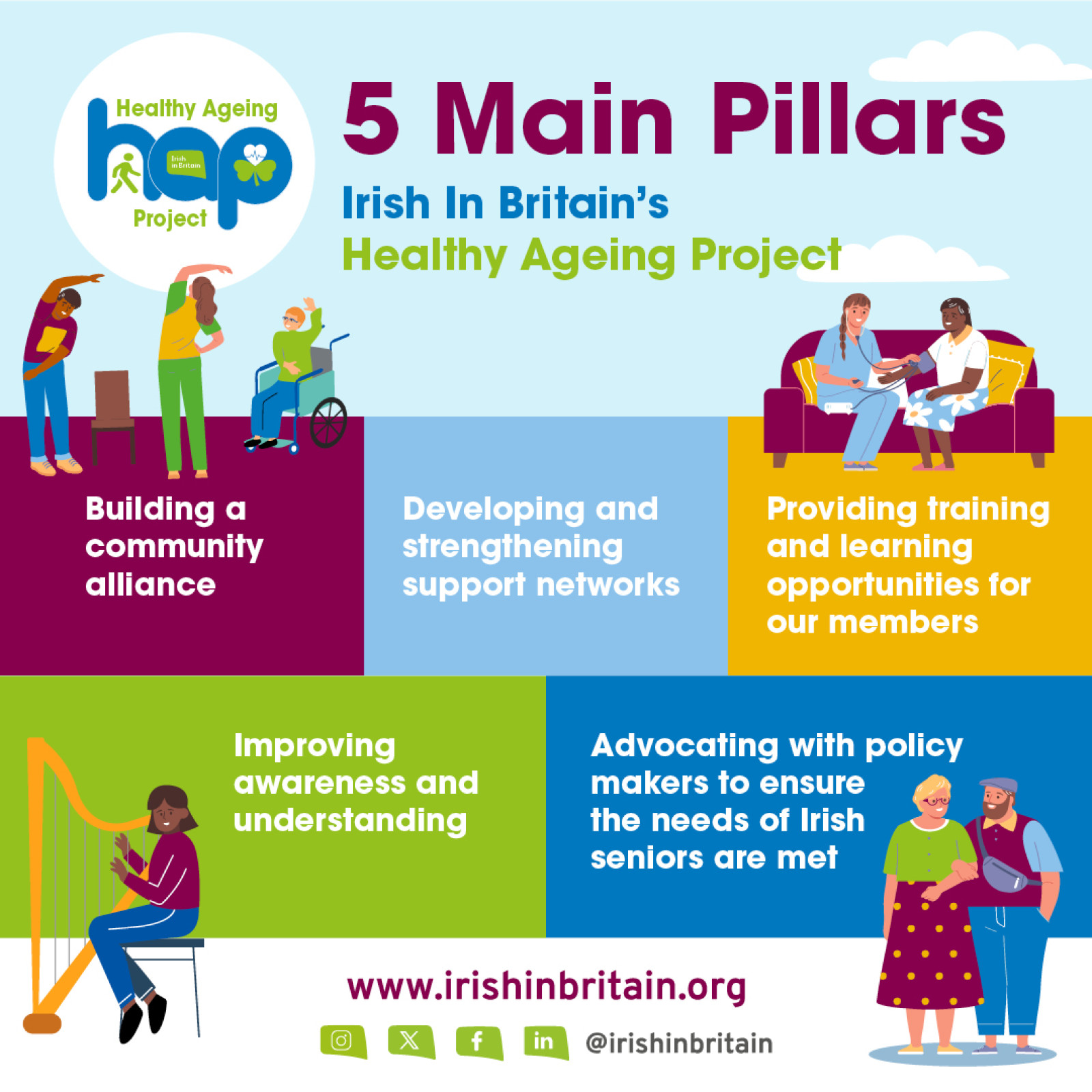 We will work with specialist health charities, research bodies, statutory services, voluntary sector groups and government. We aim to enhance the understanding of our Irish community and share of best practices