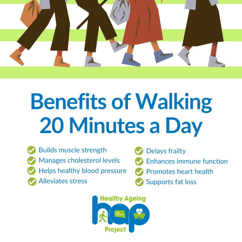 The health benefits are so important for a short, swift 20 minutes. Make sure that, if you can, you get your heart rate up to receive the full benefits from your activity!