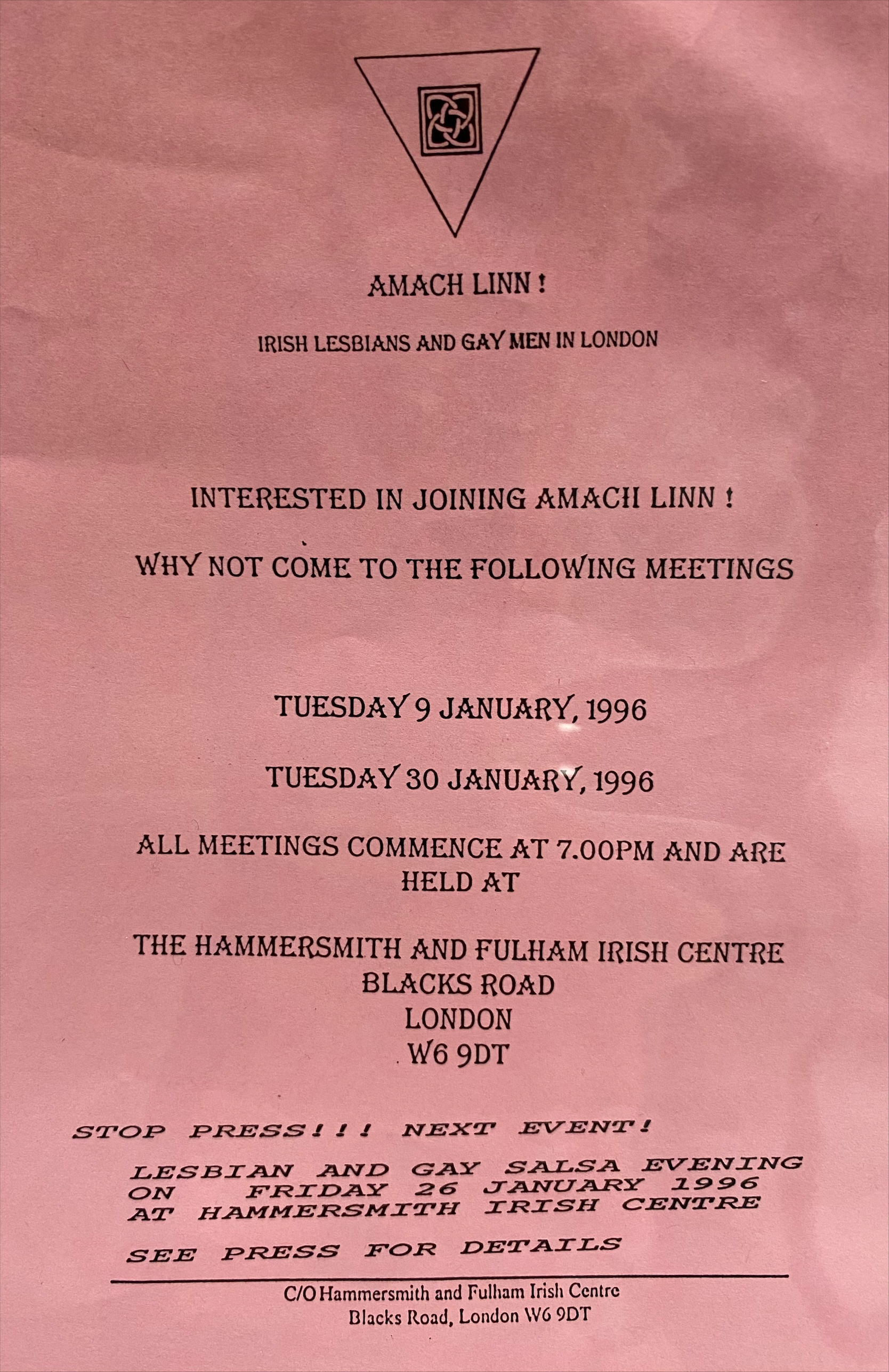 In 1995, following the first Irish Lesbian and Gay Conference in London, a London-based Irish lesbian and gay group launched. It took the name Amach Linn! (Out with Us!) and aimed to co-ordinate campaigning on issues affecting Irish lesbians and gay men and provide a social space. It also brought together men and women, reflecting cultural shifts following Ireland’s decriminalisation of male homosexuality.