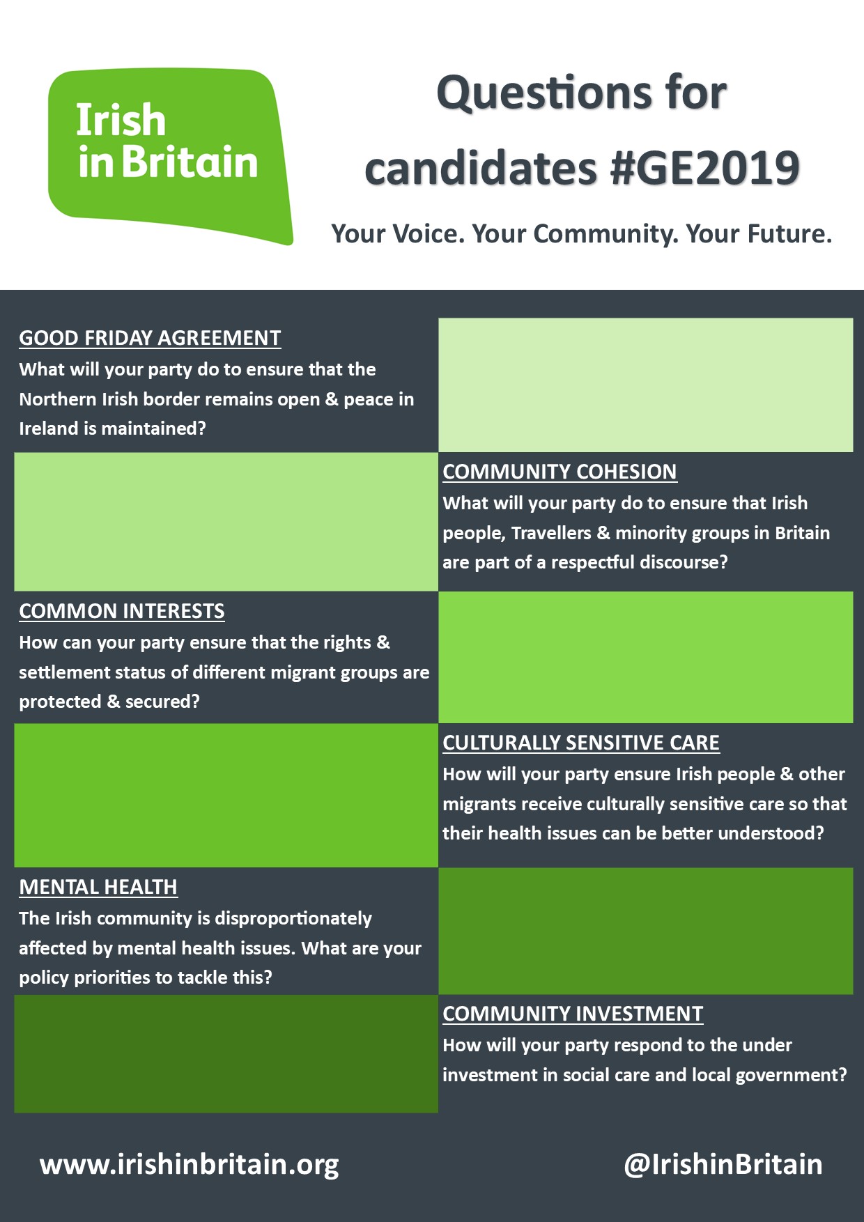 The stakes are high: topical issues are Brexit and the consequences for the future constitutional settlement; a new immigration bill; new spending priorities; and localism and representation. These issues are deeply important to Britain’s Irish community – whether you live in the most Irish constituency or the least!