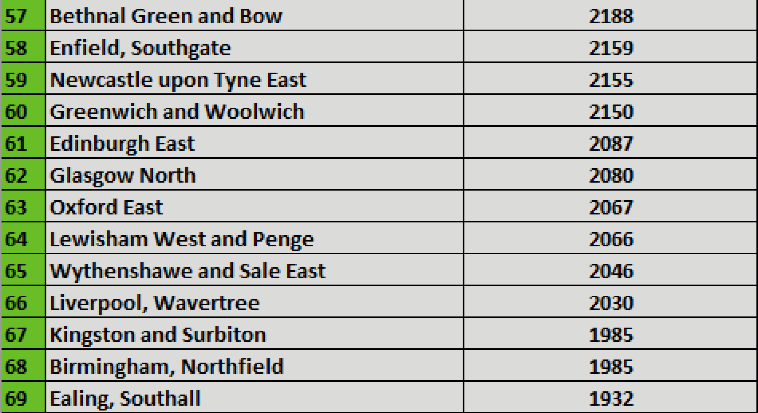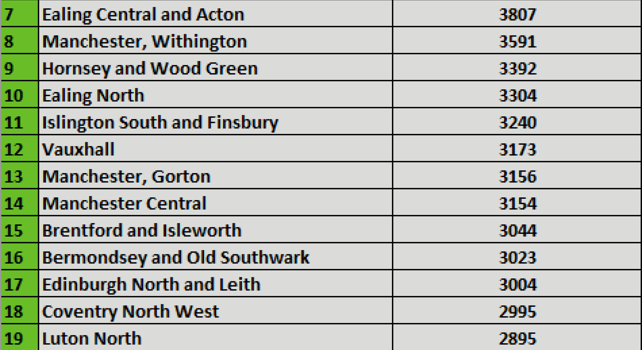 London constituencies loom large in the list with eight out of the top ten. This is not surprising as around a quarter of the Irish born in Britain were living in the capital in 2011.