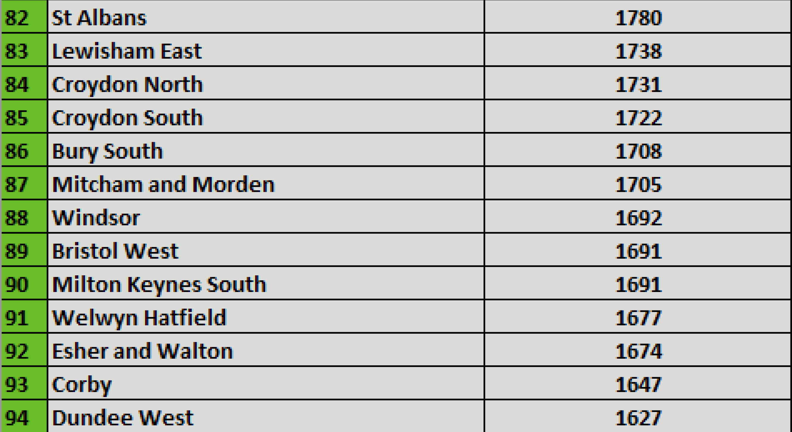 Leading figures from both Labour and the Conservatives will see their constituencies in the top 100 Irish seats. The Shadow Cabinet is well represented: Jeremy Corbyn’s Islington North is fourth highest and his other London–based colleagues Diane Abbott, John McDonnell and Emily Thornberry feature high up the list. The Prime Minister’s seat, Uxbridge and South Ruislip, is 52nd and Foreign Secretary Dominic Raab’s constituency Esher and Walton is 92nd.