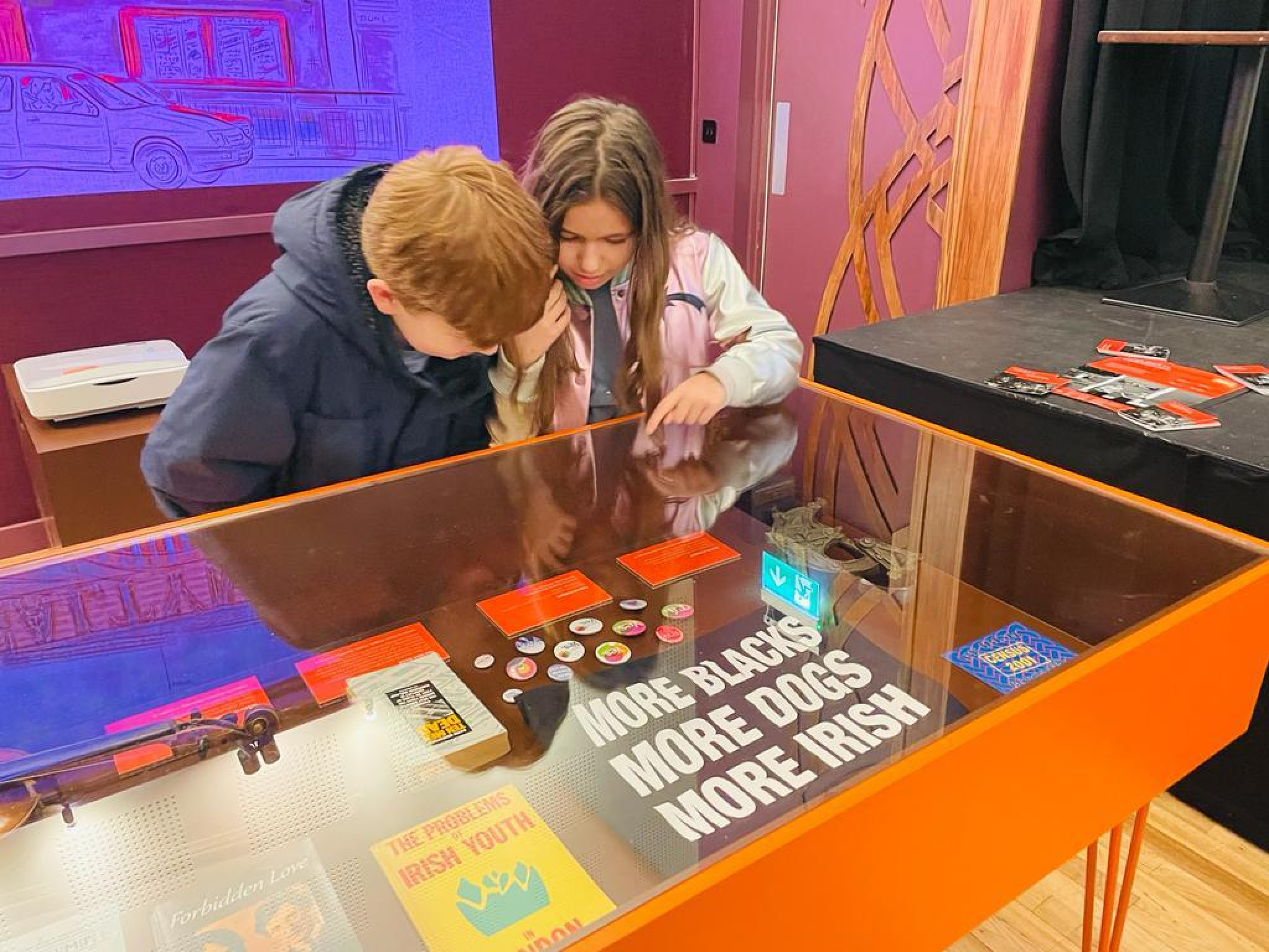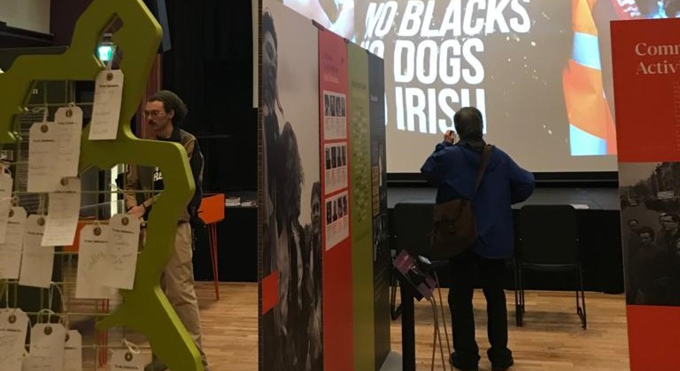Archive footage and news clips are projected on screens, artefacts include everything from a fiddle, and gig tickets to a ‘More blacks, more dogs, more Irish T shirt’. There is poetry, community activism, the experience of work and the joy of culture.