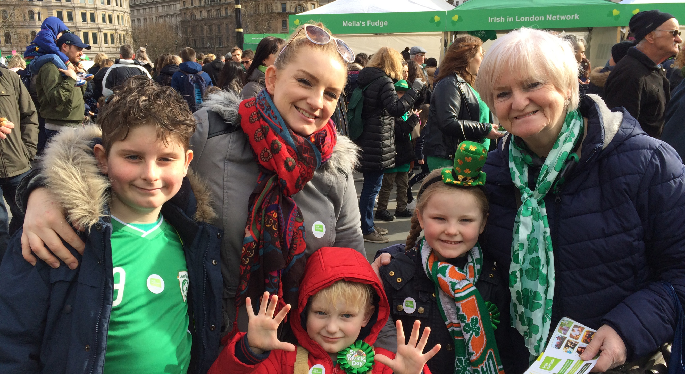 The Irish in Britain team were out and about for the Mayor of London’s St Patrick’s Day Parade and Festival on Sunday. The streets and Trafalgar Square were packed from noon. The sudden hailstorm in the midst of a sunny day did not dampen spirits and a good time was had by all!