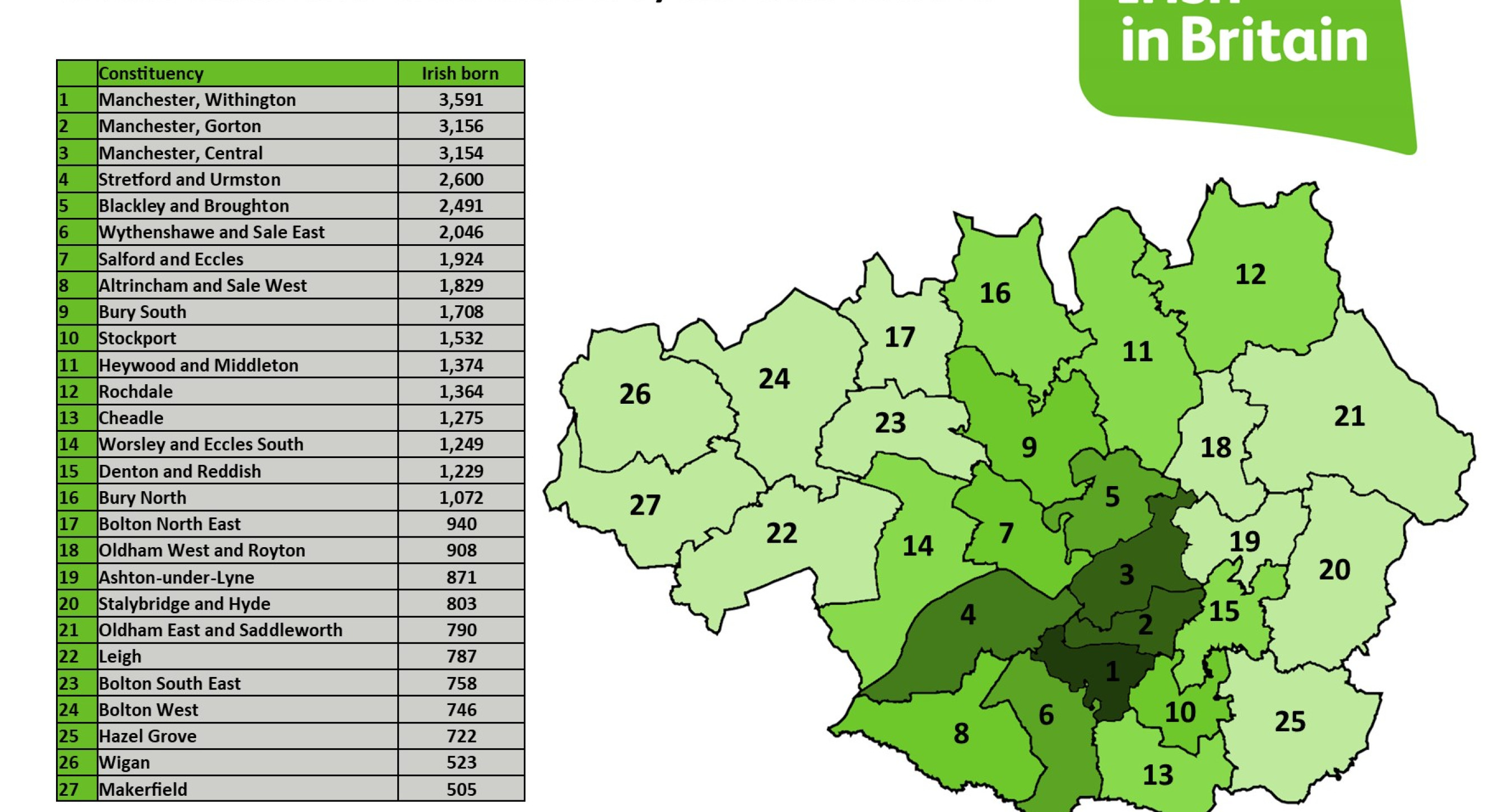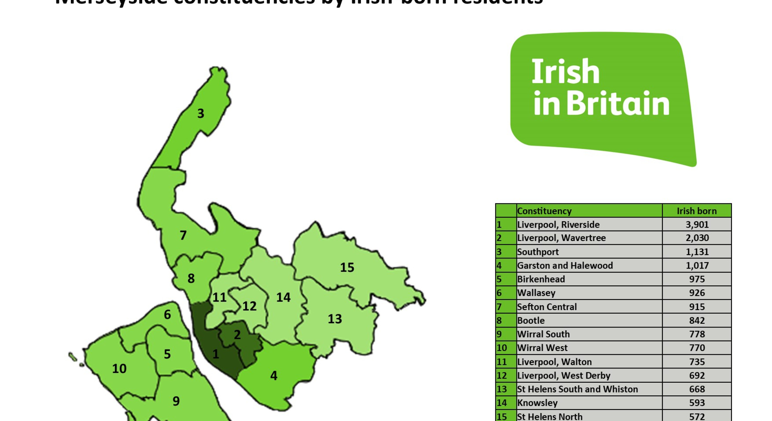 The numbers on the graphic for Merseyside may appear low as they do not account for historic migration to the area from Ireland. Many people in the area feel a close connection with Ireland even if their ancestral ties are from several generations back. Despite this, Liverpool Riverside and Wavertree are still home to thousands of Irish people – with many studying at the city’s universities.