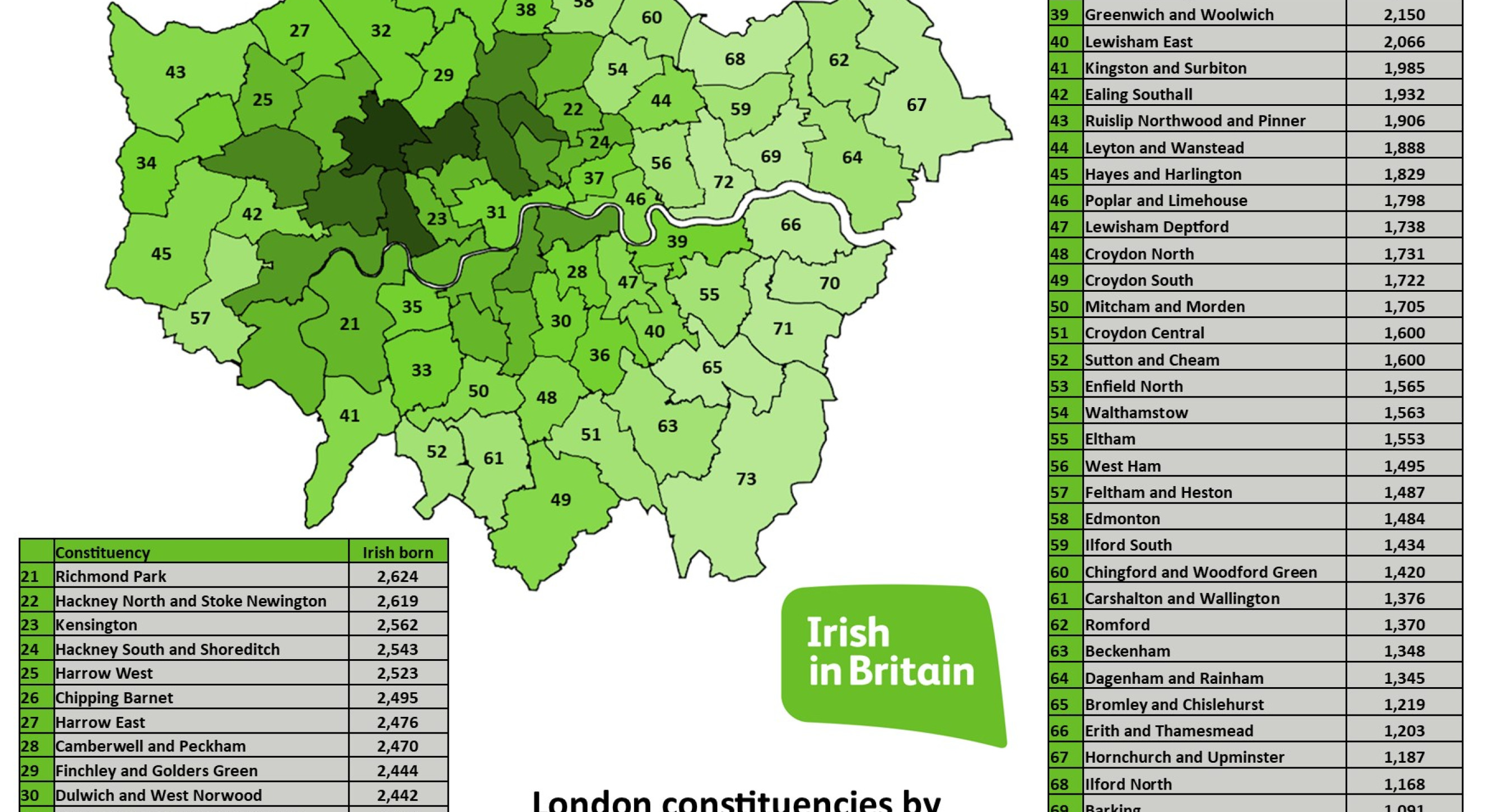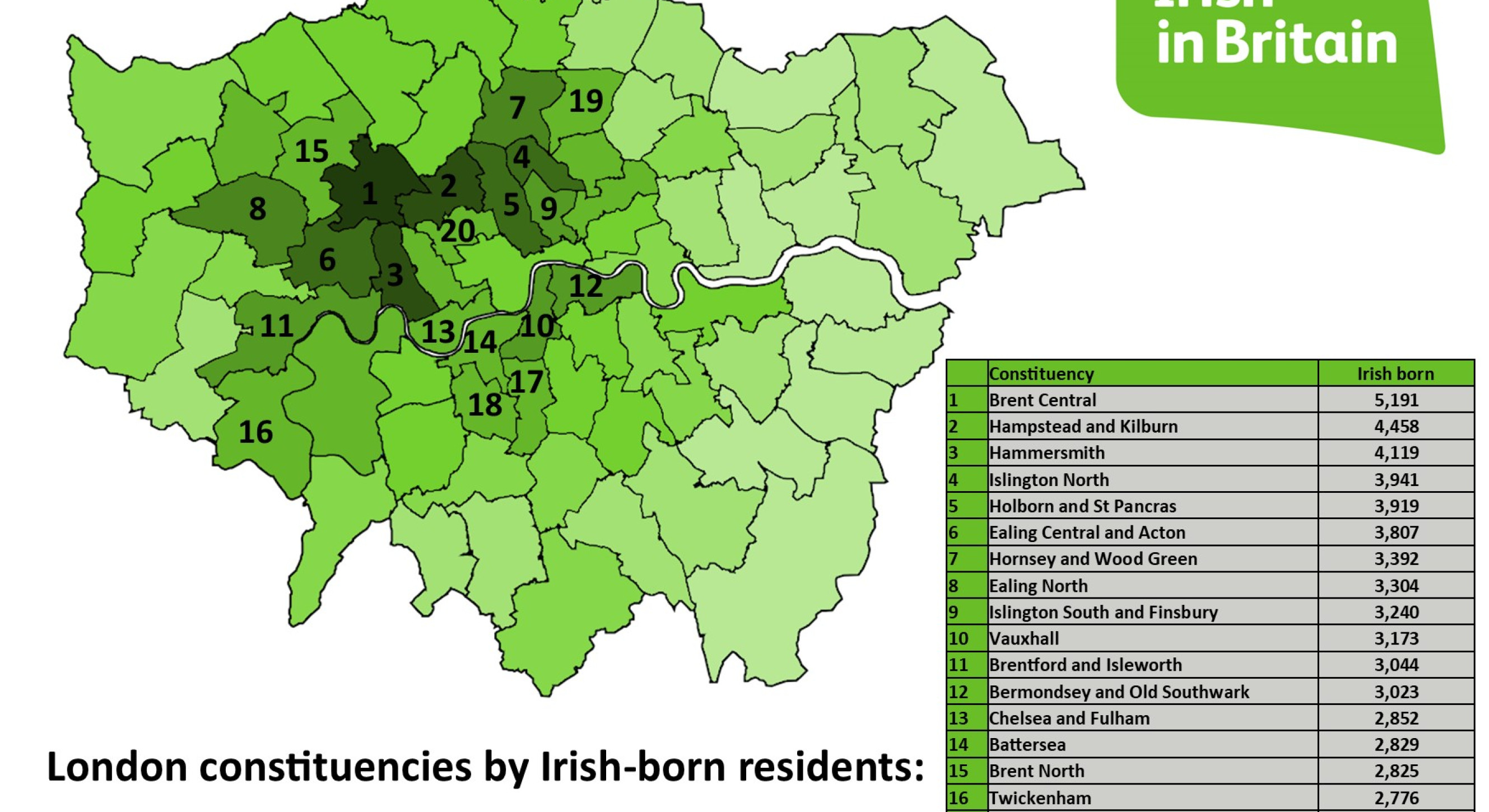 It also includes a heat map of Britain by the percentage of Irish–born in each constituency. Islington North has the highest percentage at 3.8%. The national figure is 1.1%.