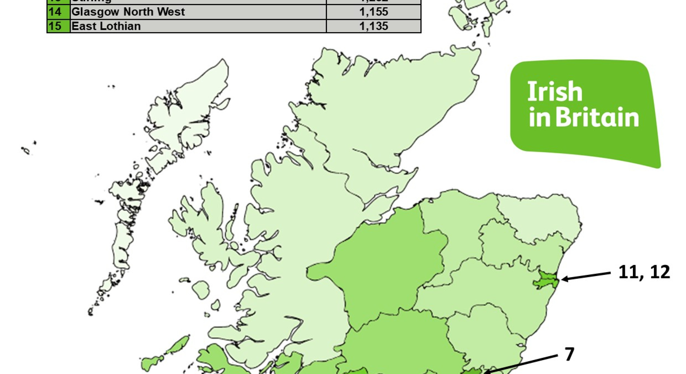 The figures highlight the dense Irish populations in cities like Coventry, Birmingham, Liverpool and Manchester. In Scotland, there are high numbers in Edinburgh, Glasgow and Dundee. In London, the Irish are very prominent in places like Ealing and Kilburn in the west and north, but other areas are very well represented like Bermondsey and Tooting in the south, as well as Wood Green and Tottenham in the north.