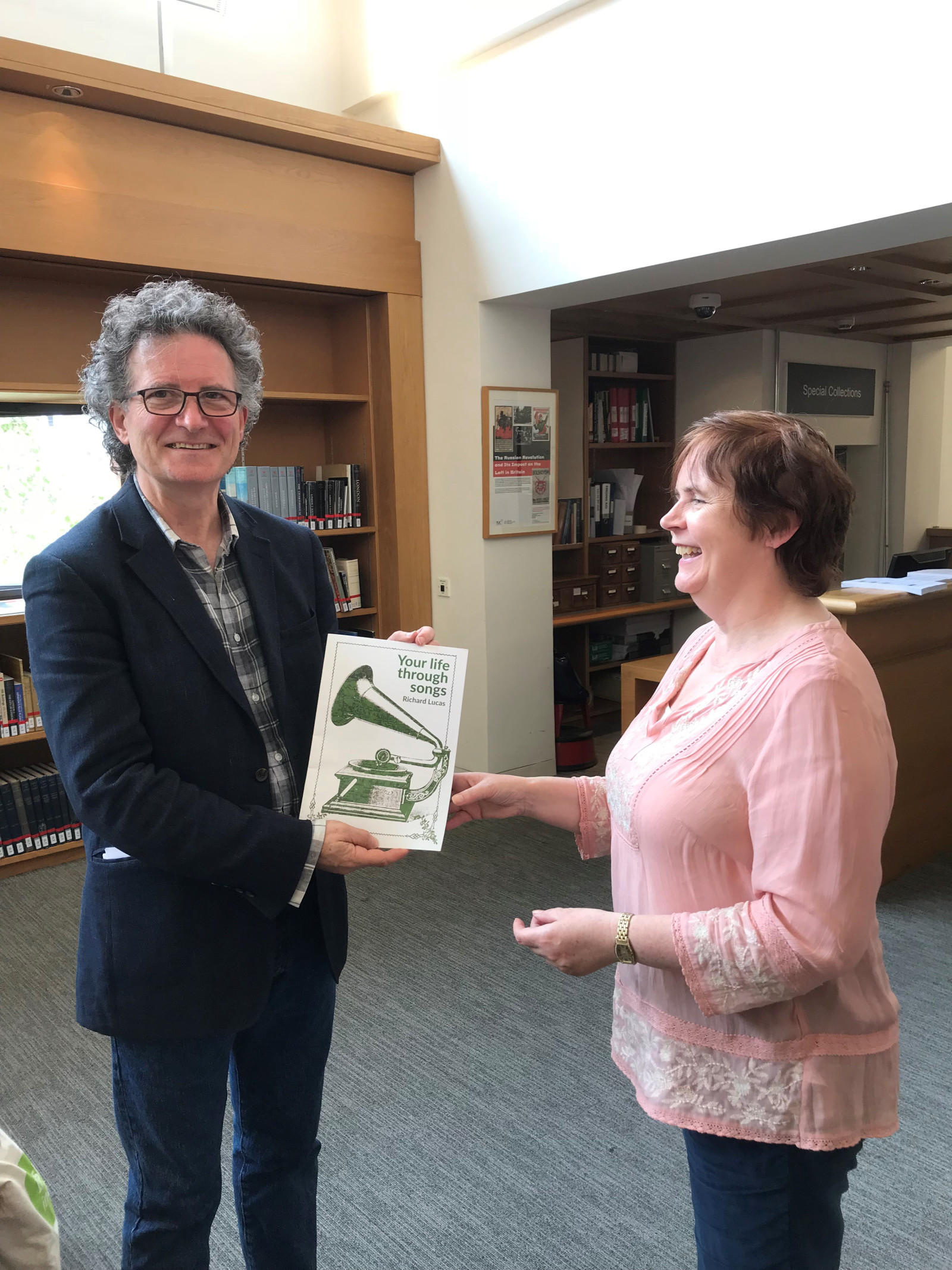 Cuimhne Champion Caroline handing a copy of fellow Champion Richard Lucas's Your Life Through Songs to Tony Murray for the collection.