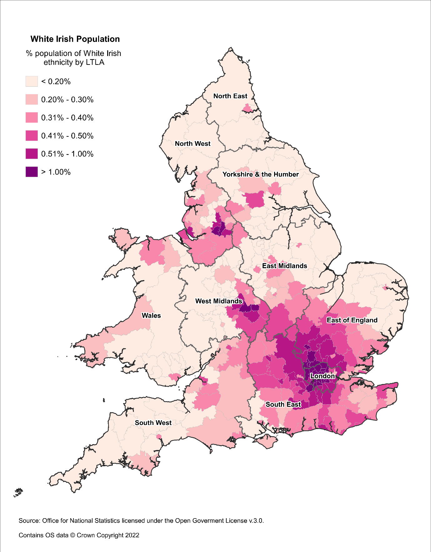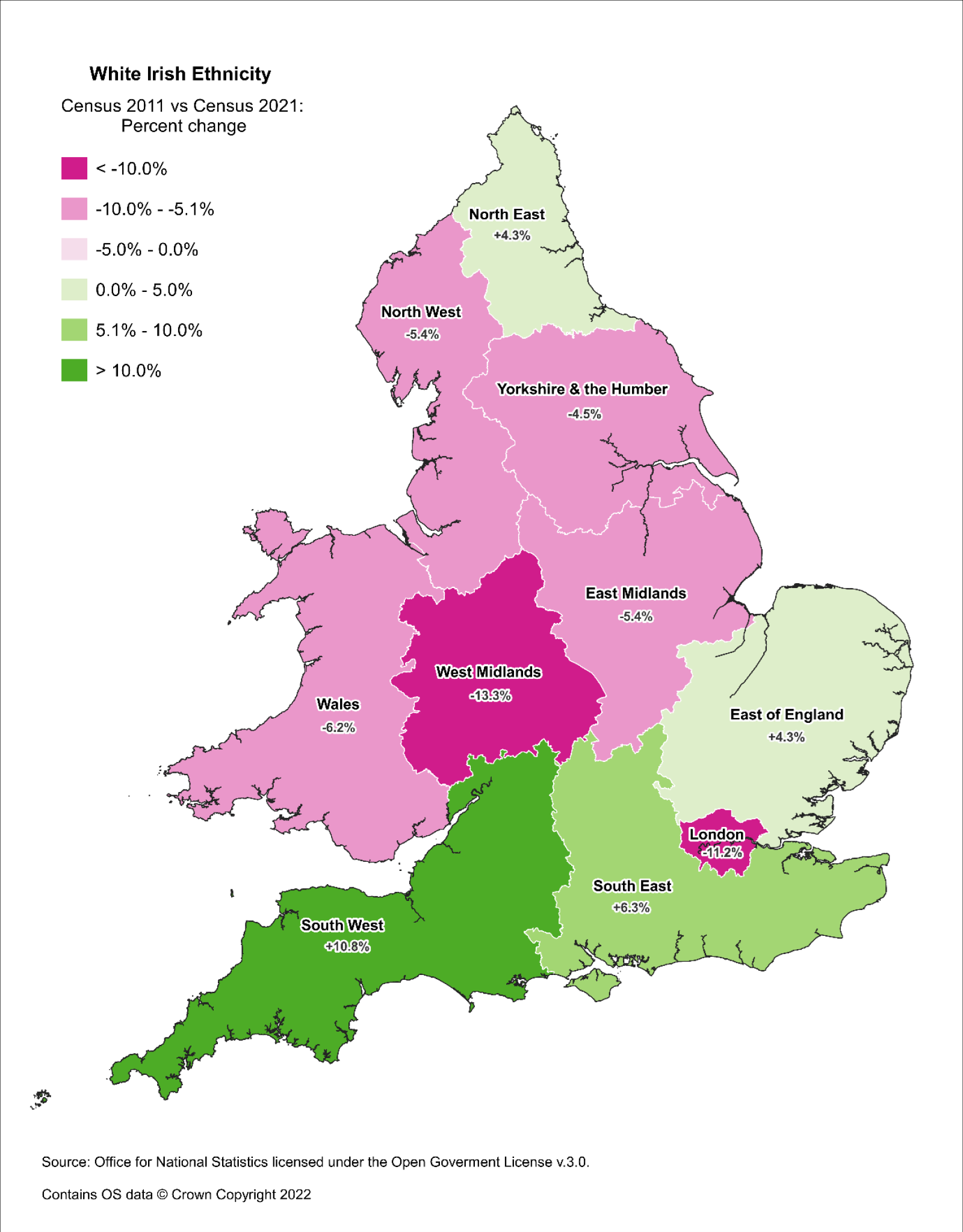 The only region to see an increase in the proportion of people identifying as Irish and/or Northern Irish was the South West of England – the experts say, correlating to some extent with the increase in White Irish population in this region.