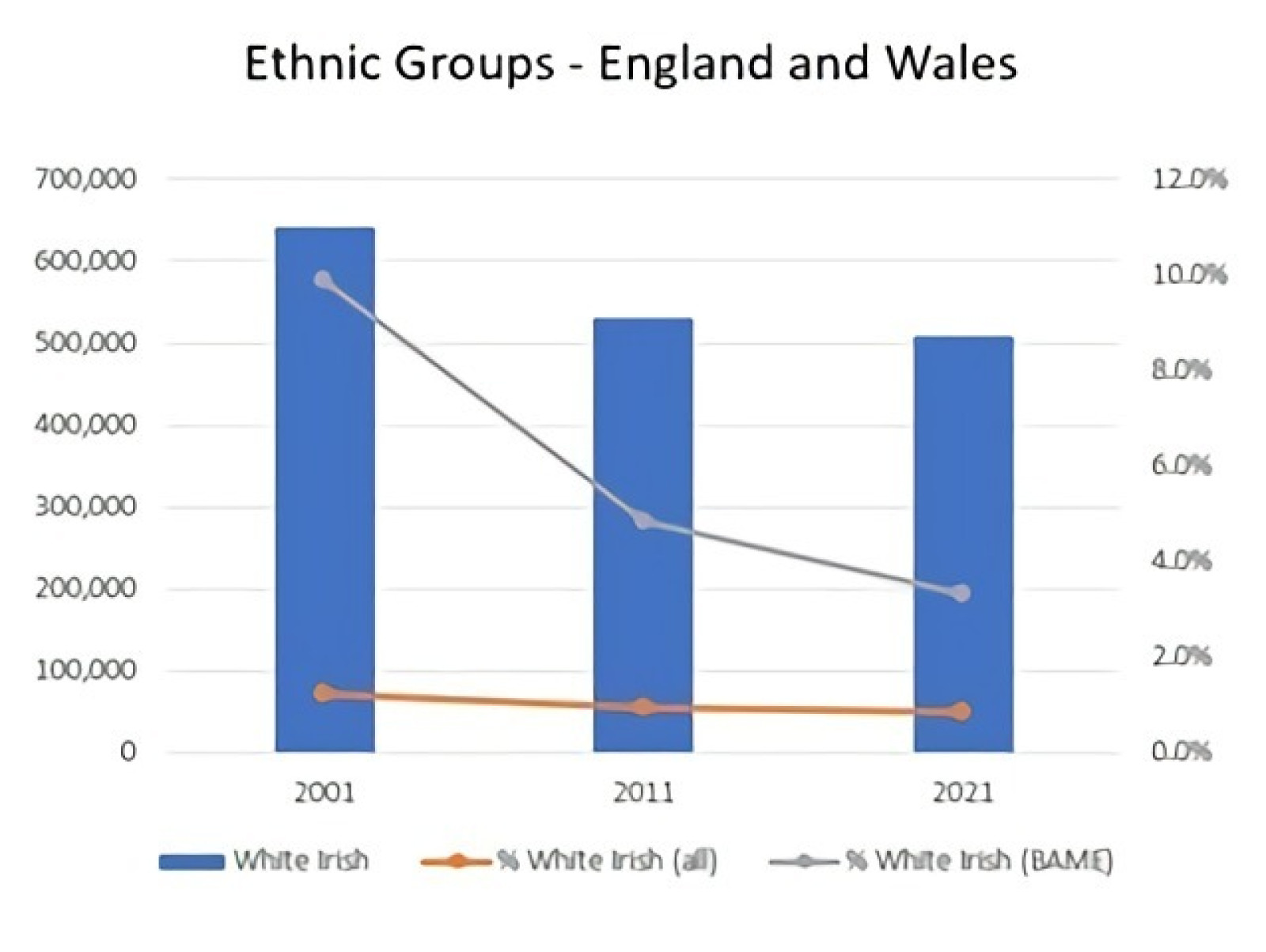 The number of people who identified as ‘White Irish’ in England and Wales at the time of the 2021 Census, has fallen by 4.4 percent, with a total of 507,465 people (23,622 down from the previous Census of 2011.