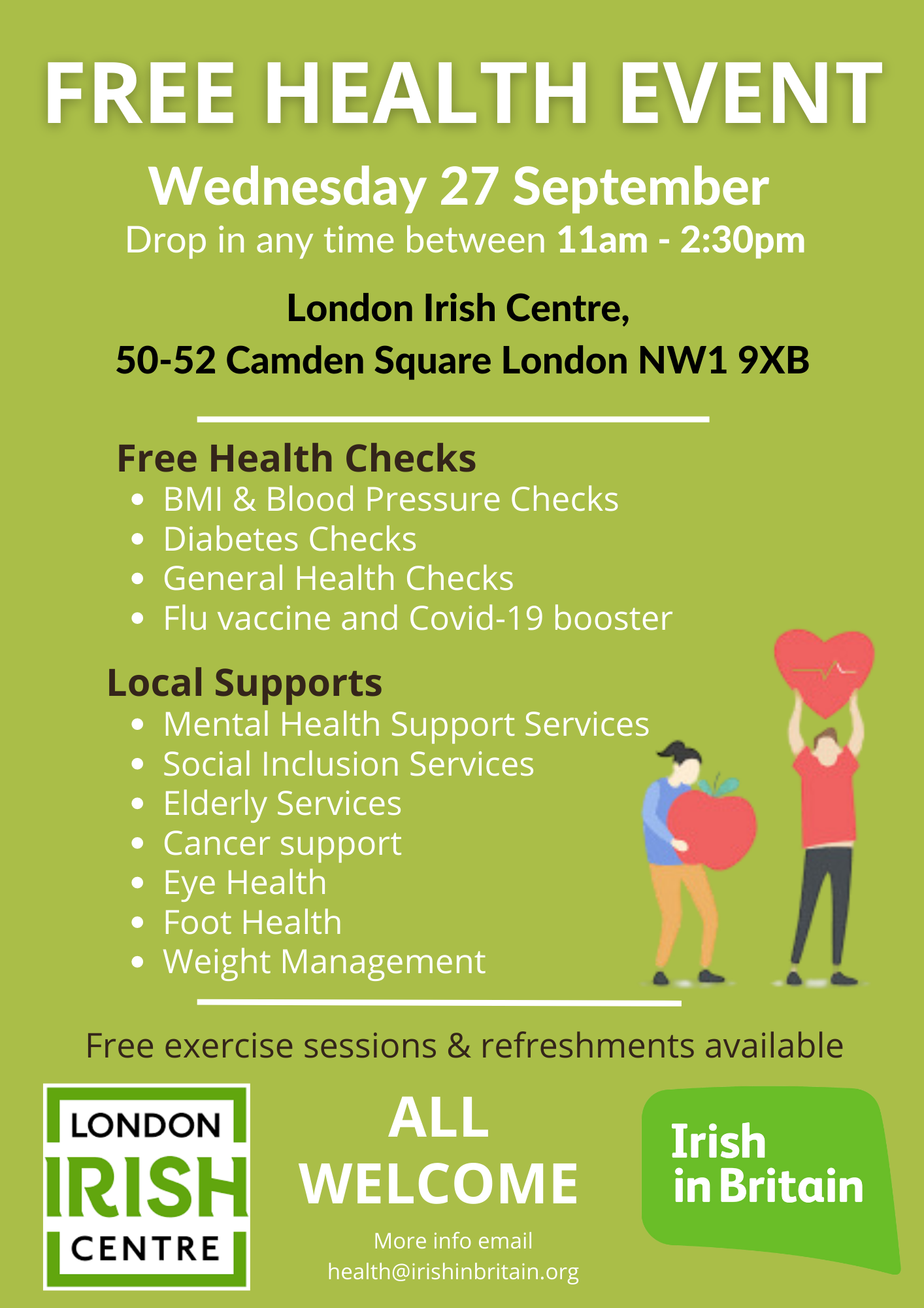 We are collaborating with The London Irish Centre again this year to host a free Community Health Event on Wednesday 27th September. Drop in any time between 11 am – 2.30pm.