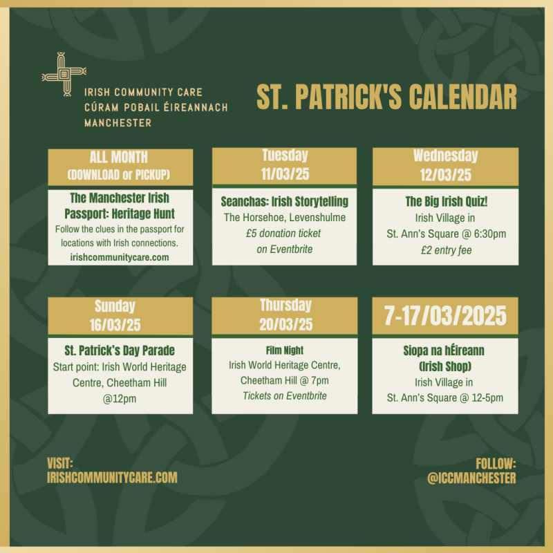It includes traditional Irish storytelling, a film night, big Irish quiz and a heritage hunt we’re calling ‘the Manchester Irish Passport’!